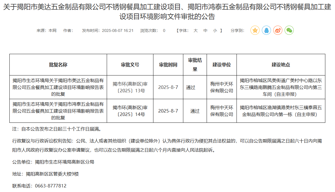 2025年8月7日,揭陽(yáng)市生態(tài)環(huán)境局高新區(qū)分局就2個(gè)不銹鋼餐具加工建設(shè)項(xiàng)目環(huán)境影響報(bào)告表作出審批通過(guò)并對(duì)外進(jìn)行公告,公告期:自本公告發(fā)布之日起三十個(gè)工作日屆滿(mǎn)。